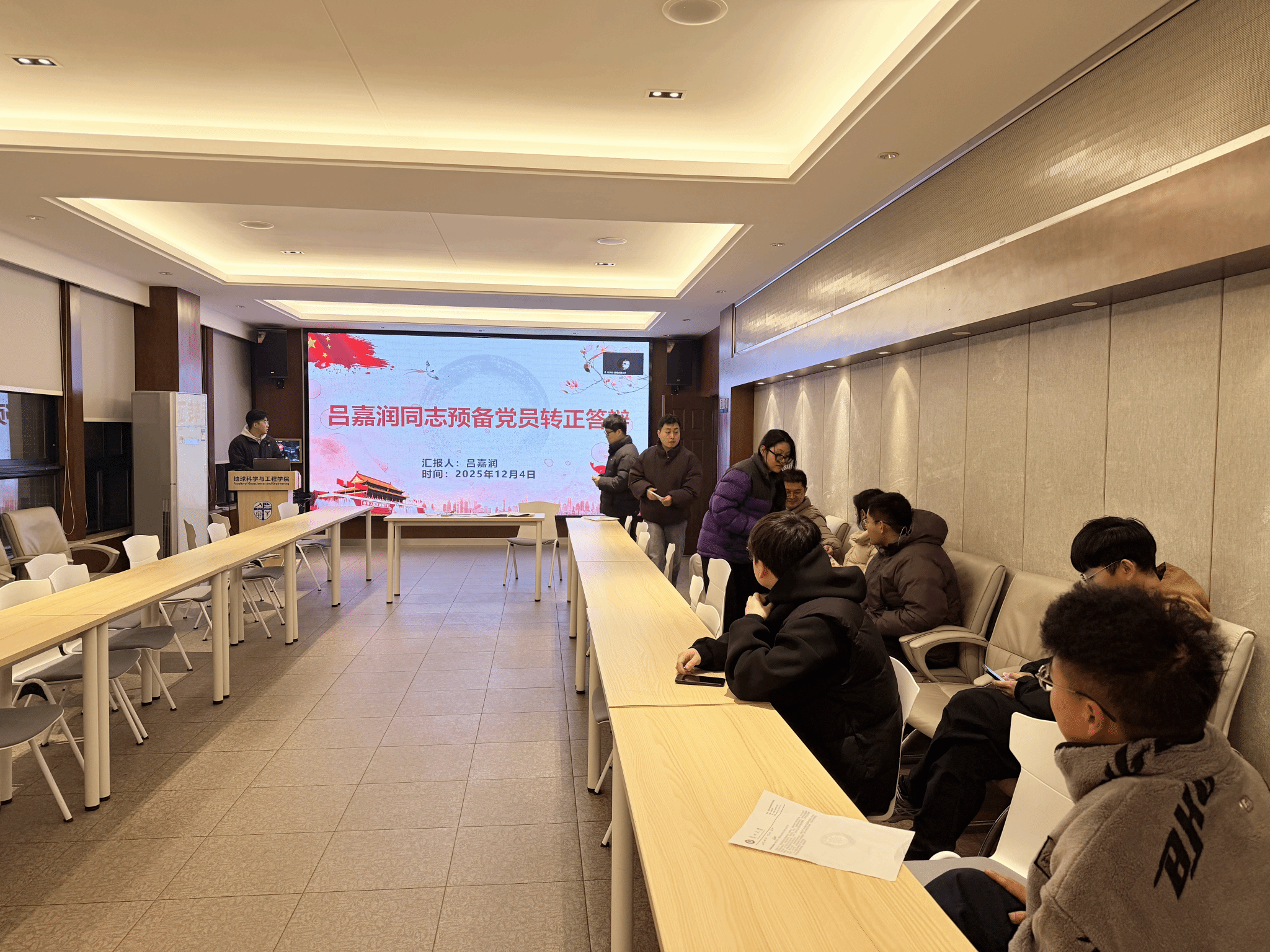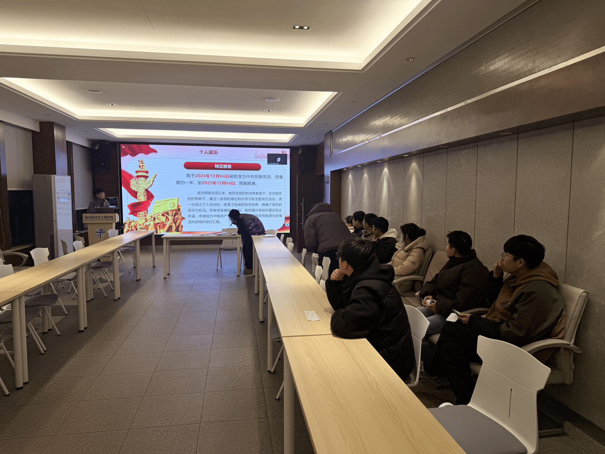 2025年12月4日,博士环境党支部召开12月主题党日活动暨预备党员接收大会、预备党员转正大会,本次会议重点围绕“学习宣传贯彻党的二十届四中全会精神,以教育强国建设支撑引领中国式现代化”,并开展专题学习研讨、预备党员接收及转正等重要议程,共24名同志参加,其中正式党员20名。大会由党支部书记朱欢欢主持。