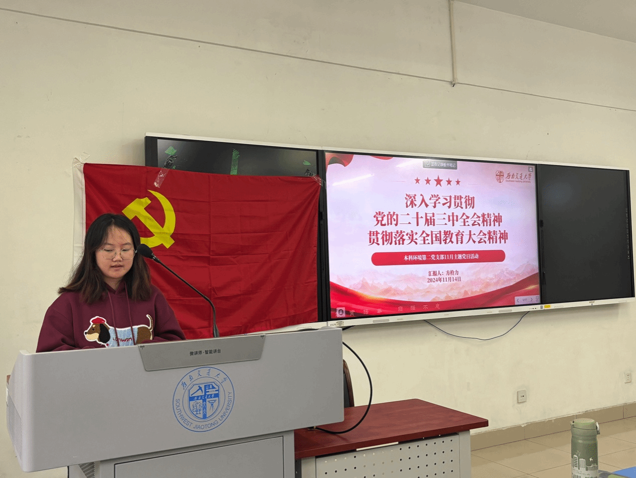 为深入学习贯彻习近平新时代中国特色社会主义思想,深入学习贯彻党的二十届三中全会精神,贯彻落实全国教育大会精神,持续跟进习近平总书记近期重要讲话和重要文章精神,本科环境第二党支部于11月14日在X2103B召开了本次是十一月主题党日活动,会议由党支部书记武若涵主持,支部全体党员参与本次活动。