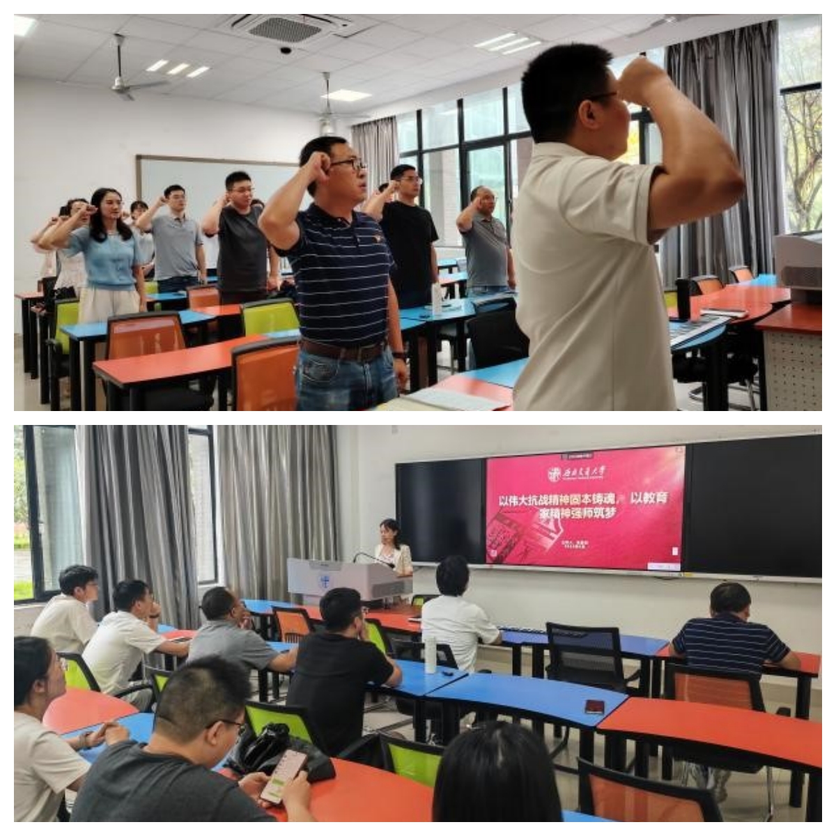 然后,第二党支部书记张胜利同志以“以伟大抗战精神固本铸魂,以教育家精神强师筑梦”为主题,为两个支部的全体党员讲专题党课。张胜利同志结合习近平总书记在纪念中国人民抗日战争暨世界反法西斯战争胜利80周年大会上的重要讲话视频,讲解了中国抗战在世界反法西斯战争中的历史地位、中华民族伟大复兴的历史必然性,呼吁全体党员同志要铭记历史、缅怀先烈、传承和弘扬伟大抗战精神,为民族复兴伟业团结奋斗。在“以教育家精神强师筑梦”部分,张胜利同志重点介绍了2025年全国“最美教师”入选者、我校首席教授、中国科学院院士翟婉明同志的先进事迹。翟院士在四十年的教学科研中始终以科学家的赤子之心,让中国高铁领跑世界;用师者的高尚情怀,将科学薪火代代相传。