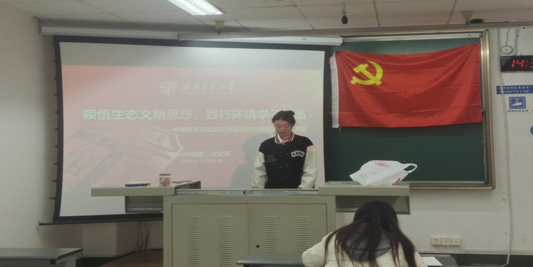11月26日,支部全体同志在支部书记刘艳霞的带领下,共同学习习近平生态文明思想的理论精髓和丰富内涵,深入领悟习近平总书记在生态文明建设中重要指示,同时,学习轨道交通领域近年来对呵护沿线生态的做的加法,切实感受中国铁路的飞速发展。通过学习大会内容和研讨,支部成员不断加强对生态文明建设的理解,深刻认识作为环境学子在生态文明建设中的重要作用,并表示将积极投入到生态文明建设中,为保护生态环境、建设美丽中国贡献力量。