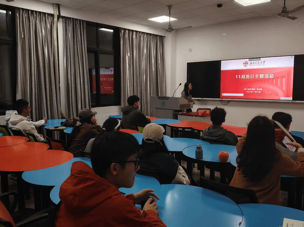 为深入学习贯彻党的二十届三中全会精神,贯彻落实全国教育大会精神;深入学习领会习近平文化思想,11月15日晚上,研2023级环境第二党支部在犀浦校区四号教学楼x4137教室开展了11月主题党日活动。本次活动由党支部书记刘婷主持。