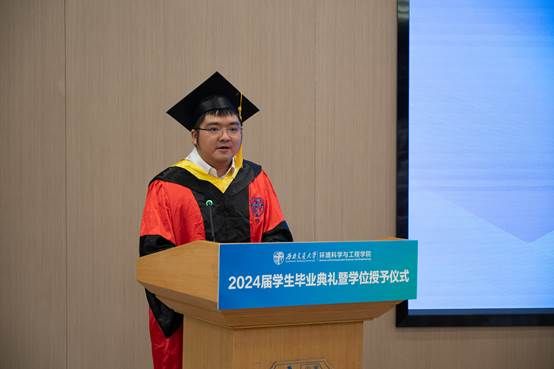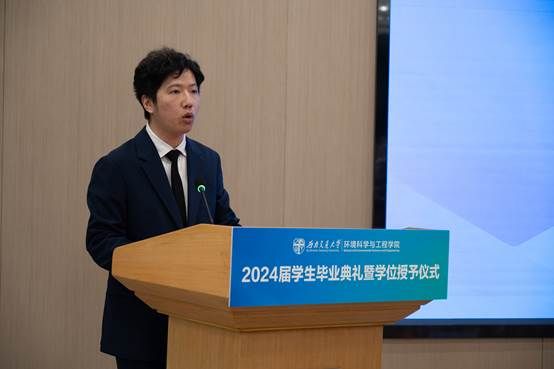 龚正君院长对即将启航的2024届毕业生表达了最真挚的祝愿与祝福,同时,离别之际,向毕业生寄予了三点暖心叮咛:一是,人生很长、挑战很多,坚韧是前行的底色。希望同学们直面生活的不易,坚持发扬敢为人先、追求卓越的精神追求,用好学习“利器”、磨砺抗挫能力、保持追求新奇与新知的兴趣热情,在“吃苦”中收获,在奉献中成长。二是,心系家国、厚植情怀,奋斗是人生的本色。生逢“两个百年”历史交织的机遇期,希望环境学子能接过美丽中国建设的接力棒,矢志奋斗,为推动中华民族勇毅前行注入磅礴力量。三是,崇德向善、行为世范,品德是致远的成色。希望环境学子,能够成为道德底线和社会良知的守护者,坚持知行合一,坚定文化自信,树立民族信仰,同时,博爱待人、宽厚处事,真正成为社会进步的正能量。