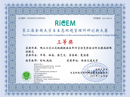赵锐、俞阳、熊欣三位老师的指导下,共有3项参赛作品获奖。其中,赵锐、熊欣老师所指导的参赛作品《城市危险废物代谢网络演变特征及政策影响:以成都为例》荣获大赛特等奖,团队成员为詹梨苹、蒋启帆、曾启浩、邱建宏;由俞阳、赵锐老师所指导的参赛作品《耦合SWAT模型和GlS的多要素流域控制单元划分研究》以及《岷江与沱江流域碳排放效率时空演变特征分析及碳减排路》分别荣获大赛二等奖、三等奖,团队成员为牟琴、杜森、陈艺戈、李佳妍、夏洁滢。