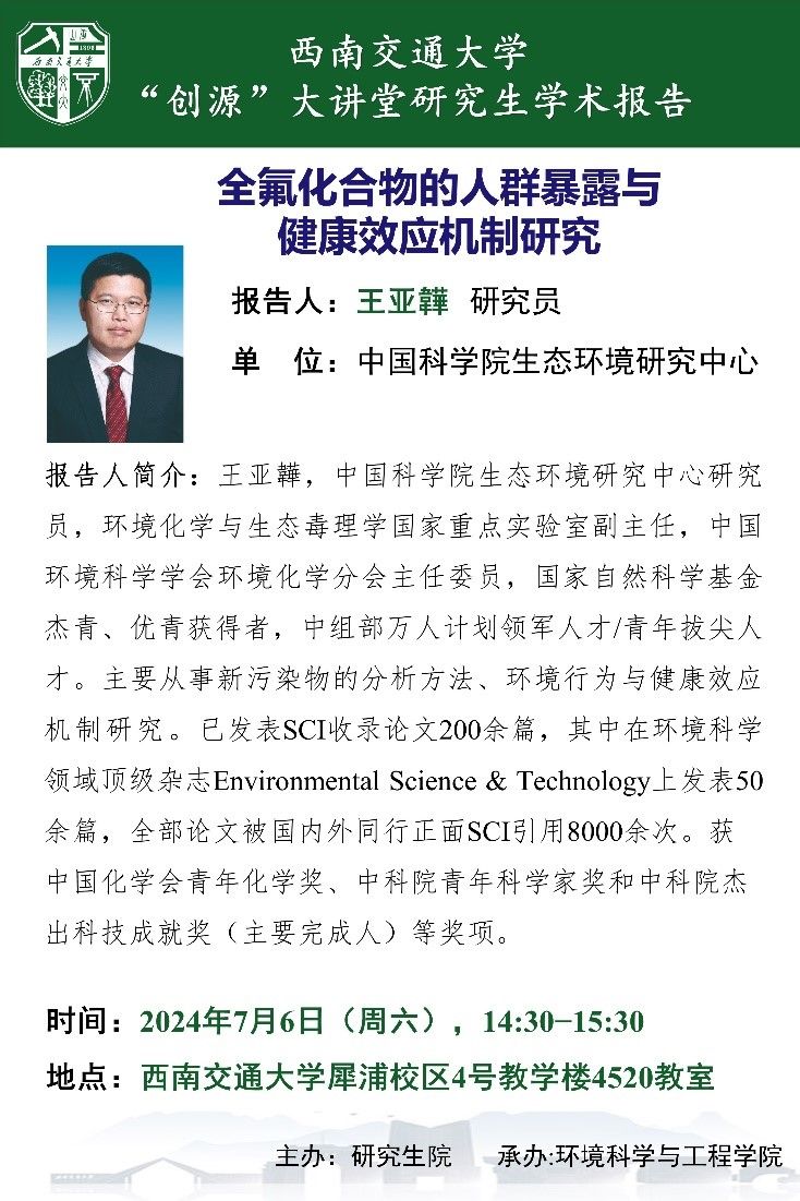 ,在犀浦校区X4520作题为“全氟化合物的人群暴露与健康效应机制研究”的学术报告。