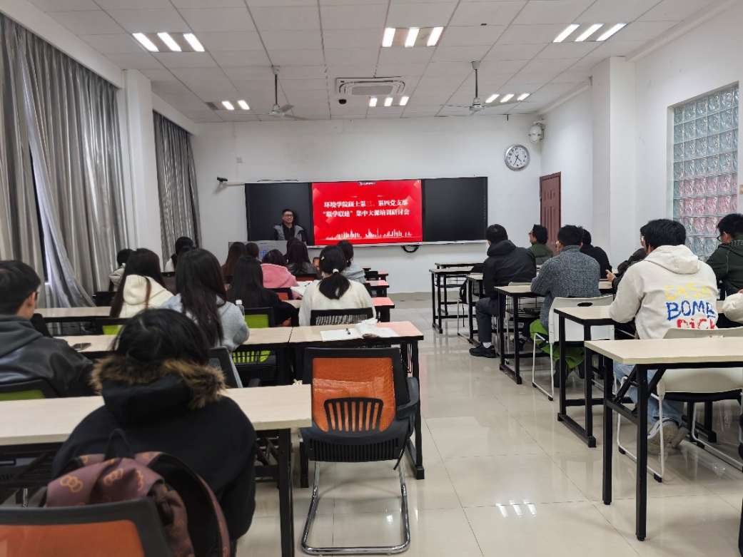 硕士第三、第四党支部联合在X4130教室联合开展了11月主题党日活动。会议由硕士第三党支部书记唐若愚主持,学院党委书记甘霖参与了本次会议。本次讨论会的两个支部各选出三、四名同学做感受类分享和实践结合分享。
