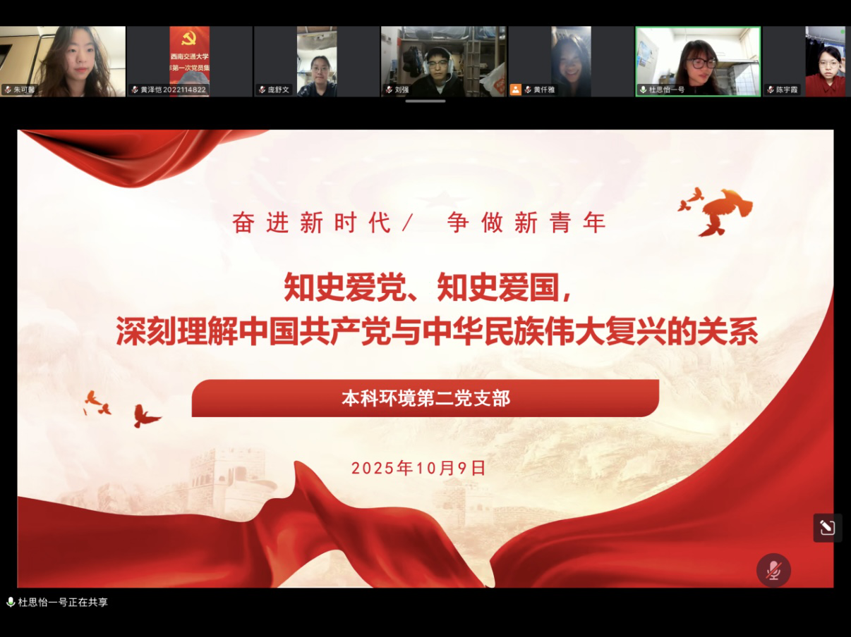 为深化党史学习教育,引导青年党员从党的百年奋斗历程中汲取智慧和力量,10月9日,本科环境第二党支部组织参加了“知史爱党、知史爱国”主题研讨活动。本次活动由本科环境第二党支部书记杜思怡同志主持,应到12人,实到10人。